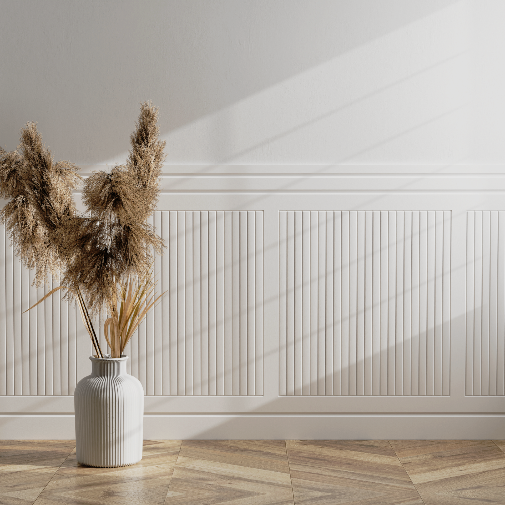 MDF-Element mit weißer Grundierung, das Material ist für die nachträgliche Lackierung in gewünschter Farbe vorbereitet.